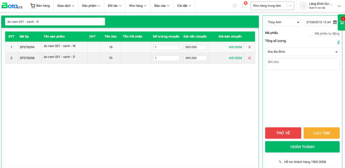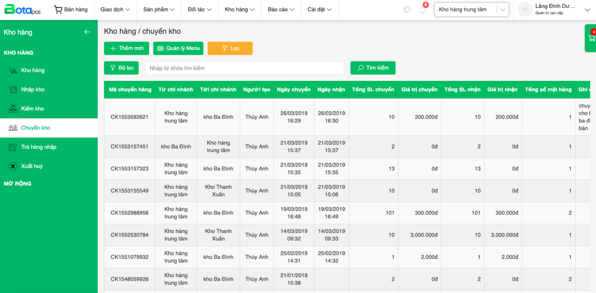 Tính năng Chuyển kho của Bota pos được sử dụng để quản lý, theo dõi việc chuyển sản phẩm giữa các kho/chi nhánh trong chuỗi cửa hàng với nhau, đảm bảo chính xác số lượng hàng tồn kho trong quá trình kinh doanh.