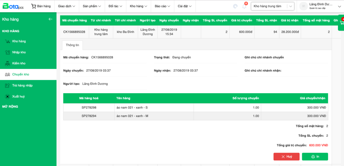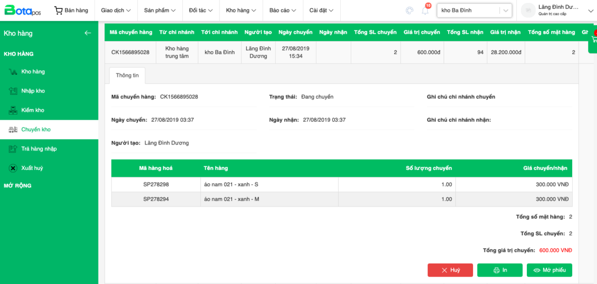 - Bước 3:Sau khi thực hiện các bước trên, phiếu chuyển hàng mới sẽ ở trạng thái đang chuyển tại kho gửi đến. Lúc này bạn có thể chọn In, Sửa, Hủy nếu muốn