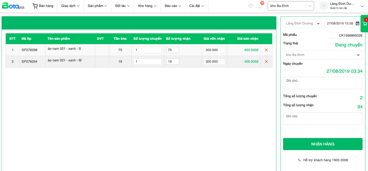 – Kho nhận hàng đến là Chi nhánh Ba Đình