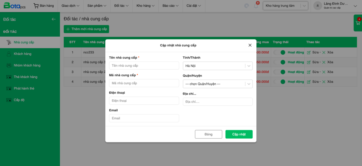 – Có thể sửa/xóa thông tin nhà cung cấp khi đã ấn câp nhật :